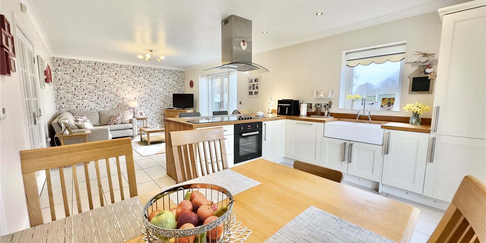 The property is beautifully presented throughout and offers generous, well-balanced accommodation ideal for modern family living. Internally, a welcoming entrance hallway leads to a ground floor WC, a comfortable front-facing lounge, and an impressive open-plan kitchen and living space spanning the rear of the home—perfect for everyday living and entertaining alike—complemented by a separate utility room.