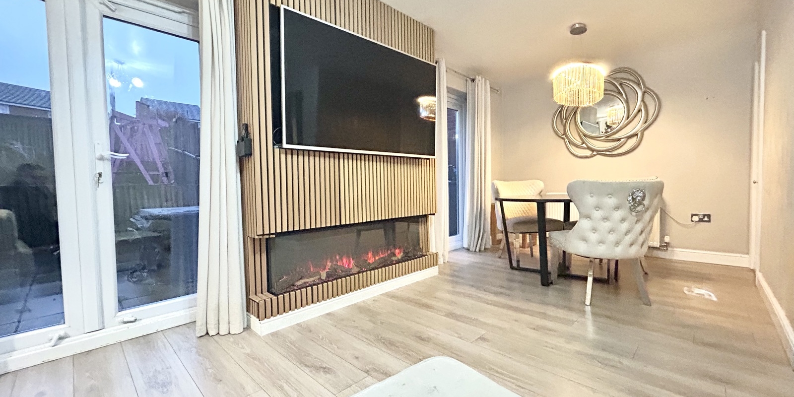 The staircase to the first floor is enhanced with feature acoustic wood panelling and integrated lighting, adding a contemporary design touch. The master bedroom benefits from an en-suite shower room, while bedrooms two and three are both well-proportioned doubles. The accommodation is completed by a modern three-piece family bathroom.