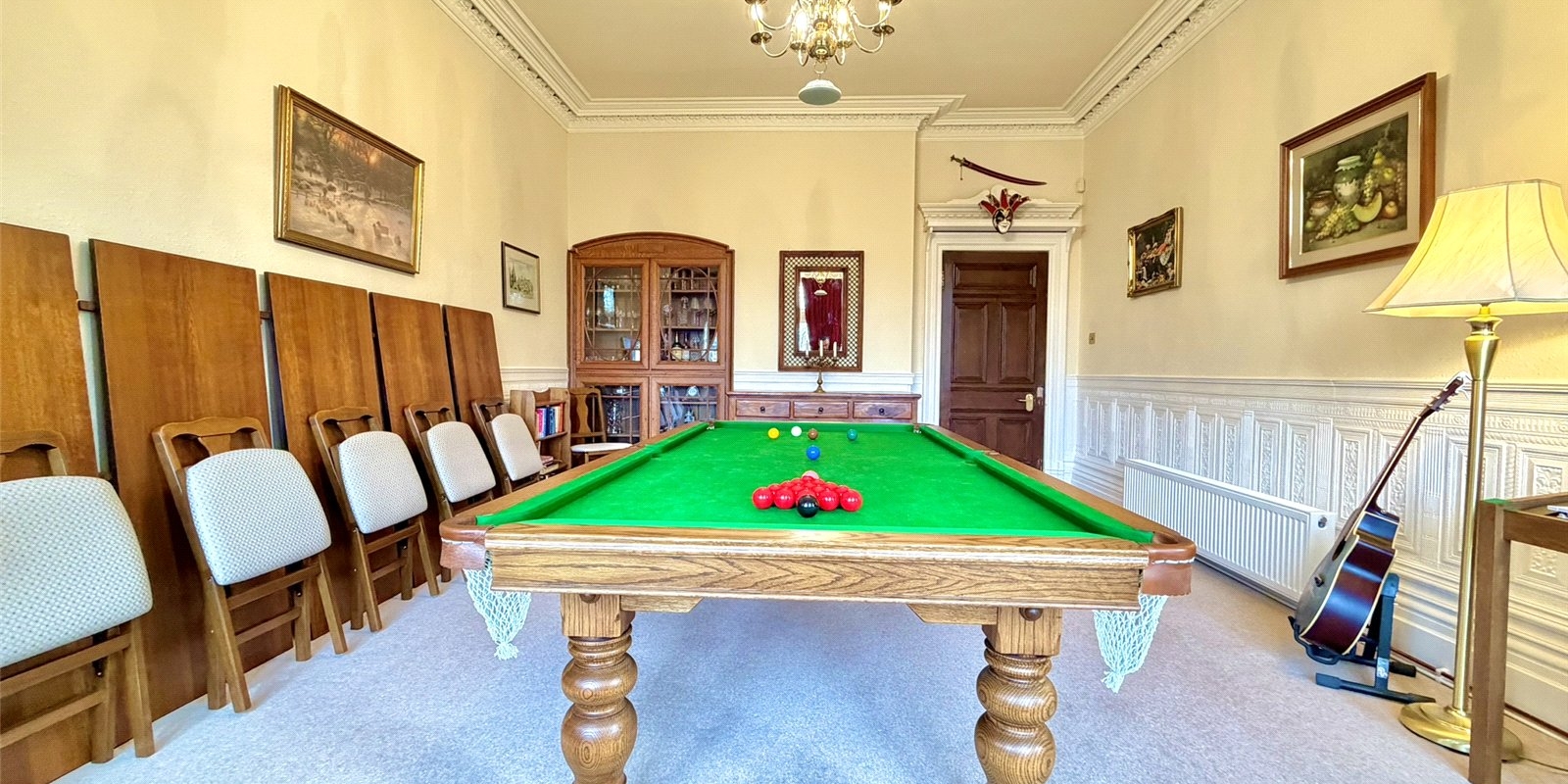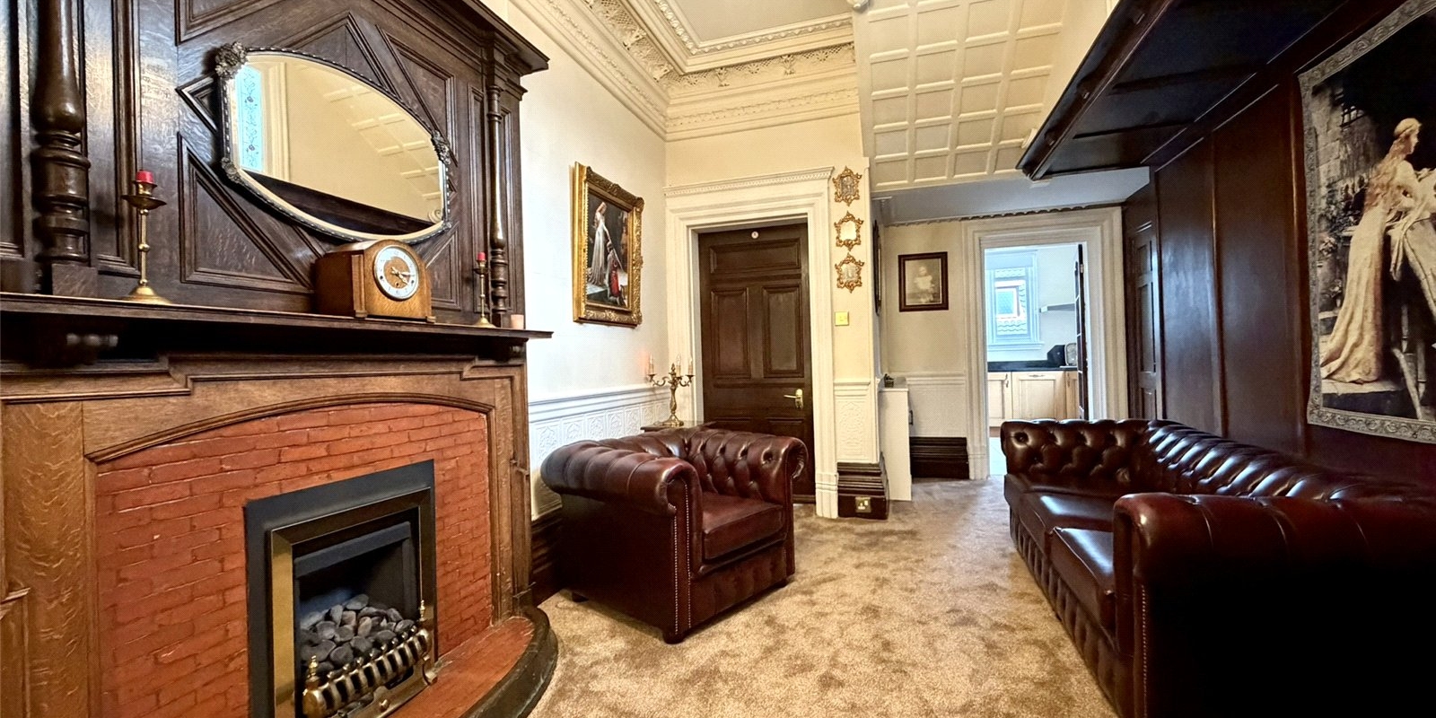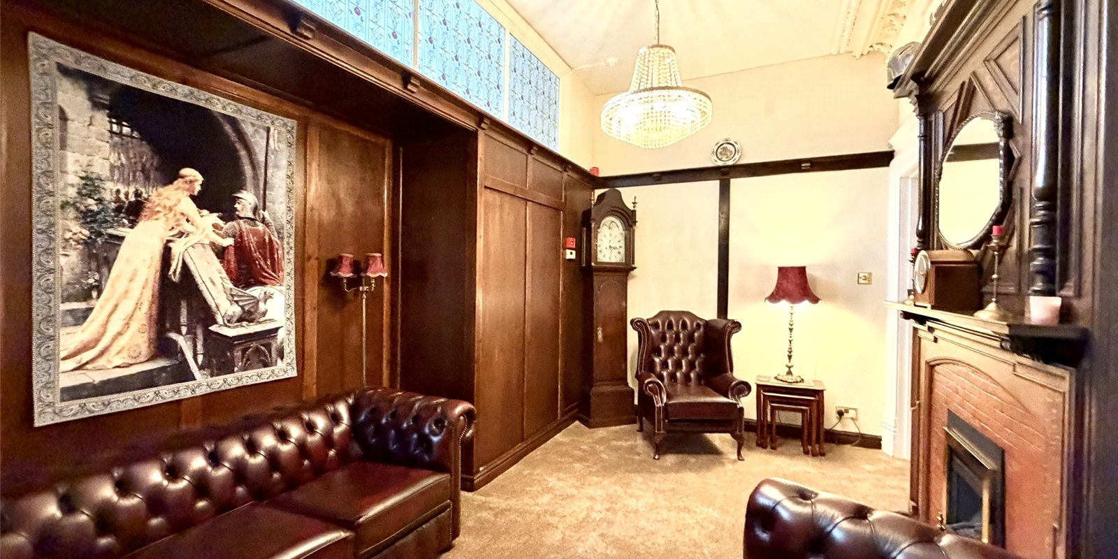 A second reception room offers a more intimate snug-style space, complete with original wood panelling, stained glass windows and a characterful feature fireplace, while the third reception room serves as an elegant formal dining room.