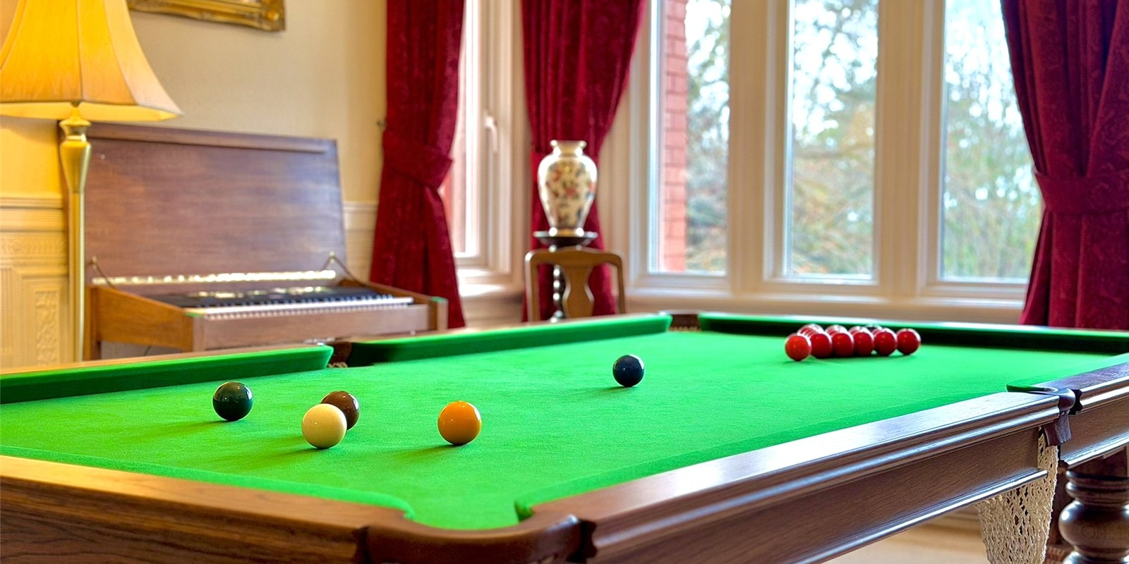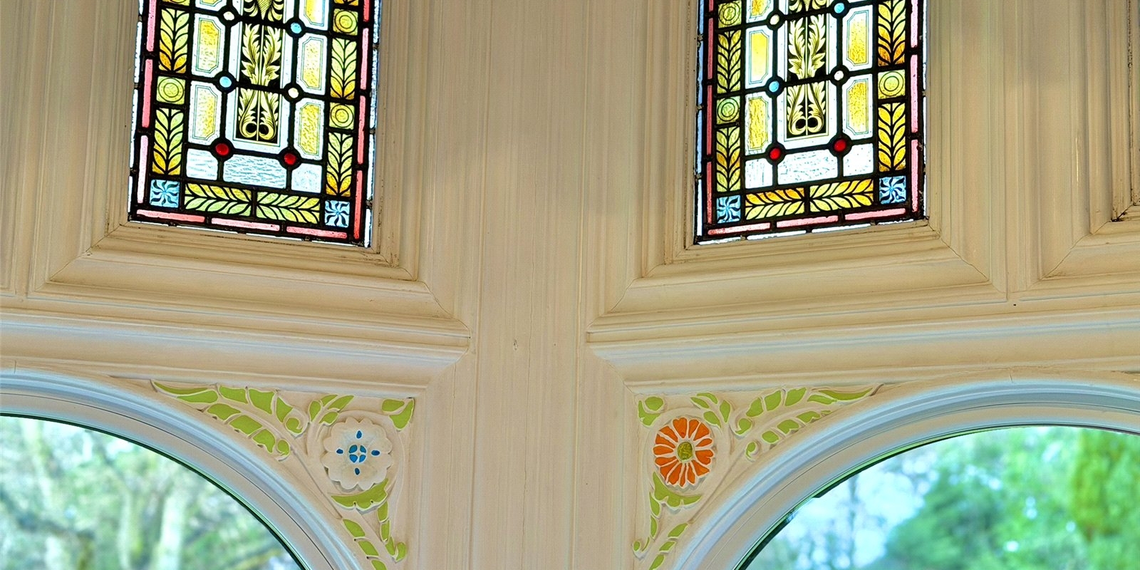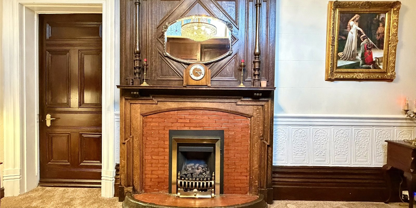 A second reception room offers a more intimate snug-style space, complete with original wood panelling, stained glass windows and a characterful feature fireplace, while the third reception room serves as an elegant formal dining room.