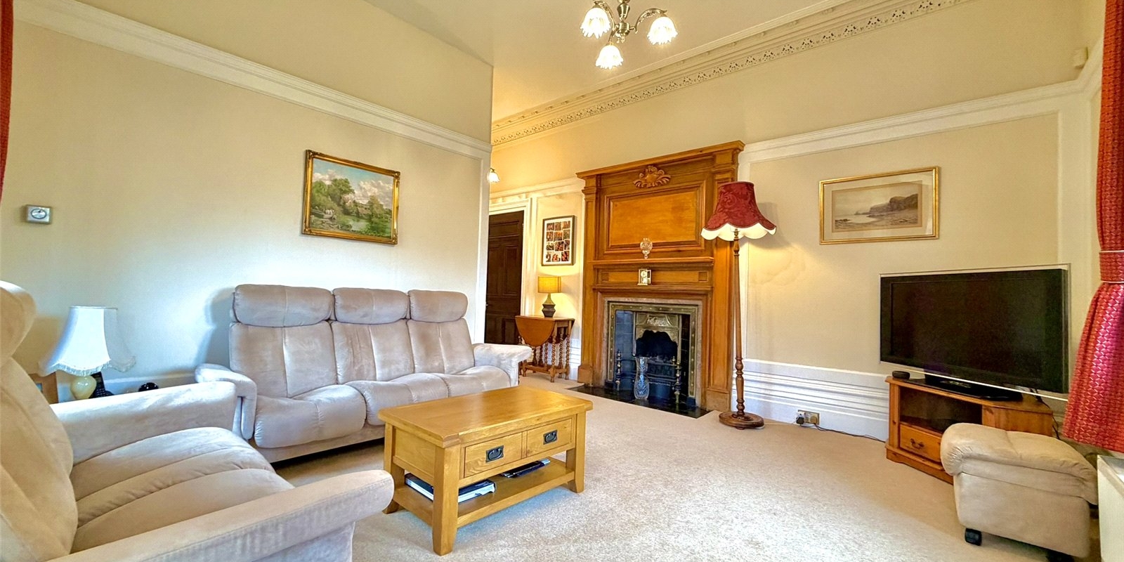 Arranged over two generous levels, the property showcases three grand reception rooms, each with its own distinct atmosphere. The principal lounge is a striking focal point, featuring a beautiful turret bay that provides the perfect setting for a dining table and entertaining guests.