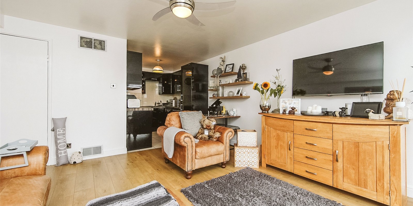 Inside, the apartment comprises a spacious hallway with useful built-in storage, leading into a bright and generously sized open-plan lounge and dining area. The kitchen has been recently updated and features stylish units, ample worktop space, and modern appliances, ideal for everyday living and entertaining.