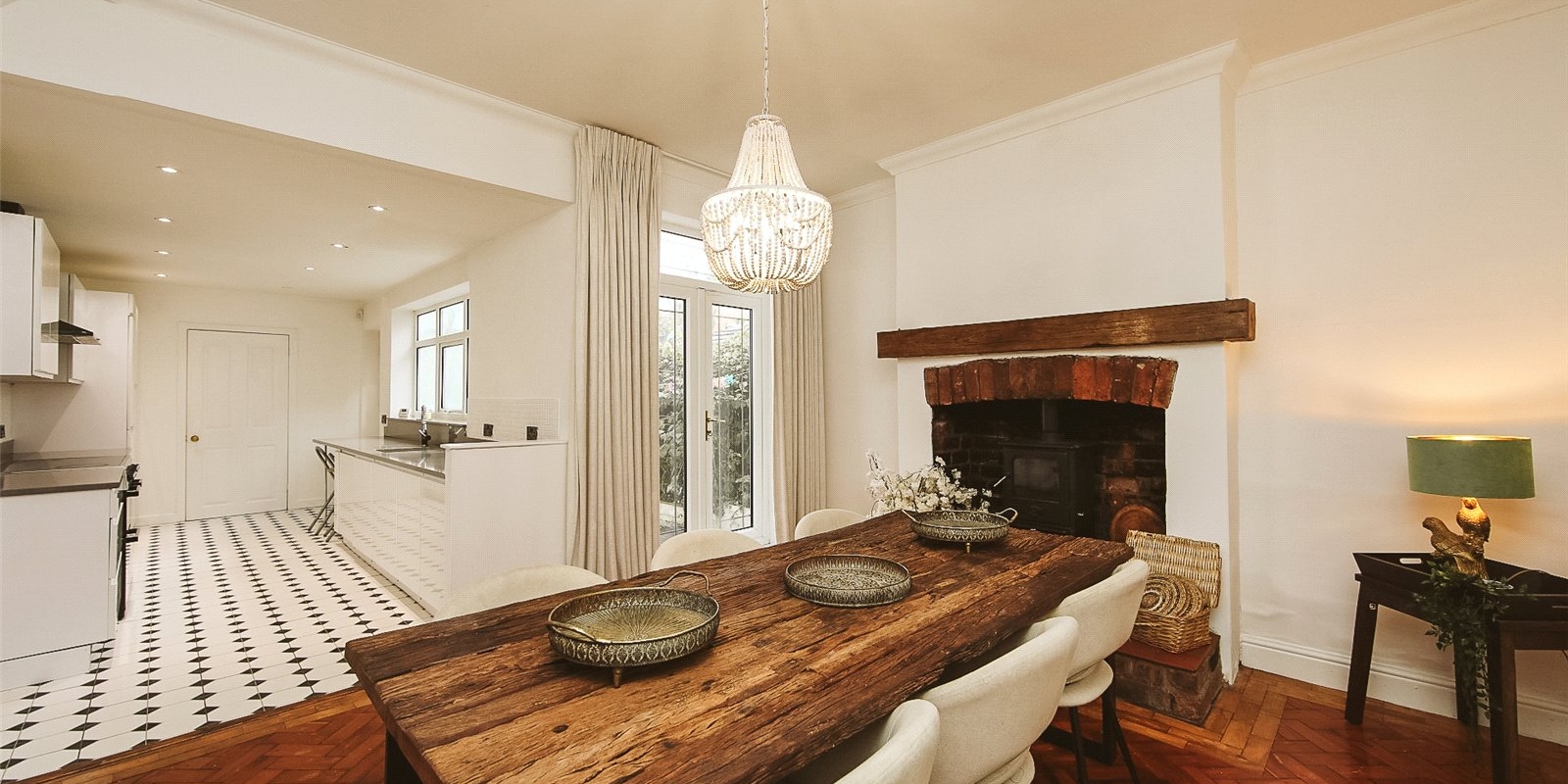 To the left of the hallway lies the first of two beautifully appointed reception rooms, bathed in natural light from a large bay window – an ideal space for a formal dining room or an additional family living area, the room also boasts double doors to a lovely garden patio, perfect for entertaining.