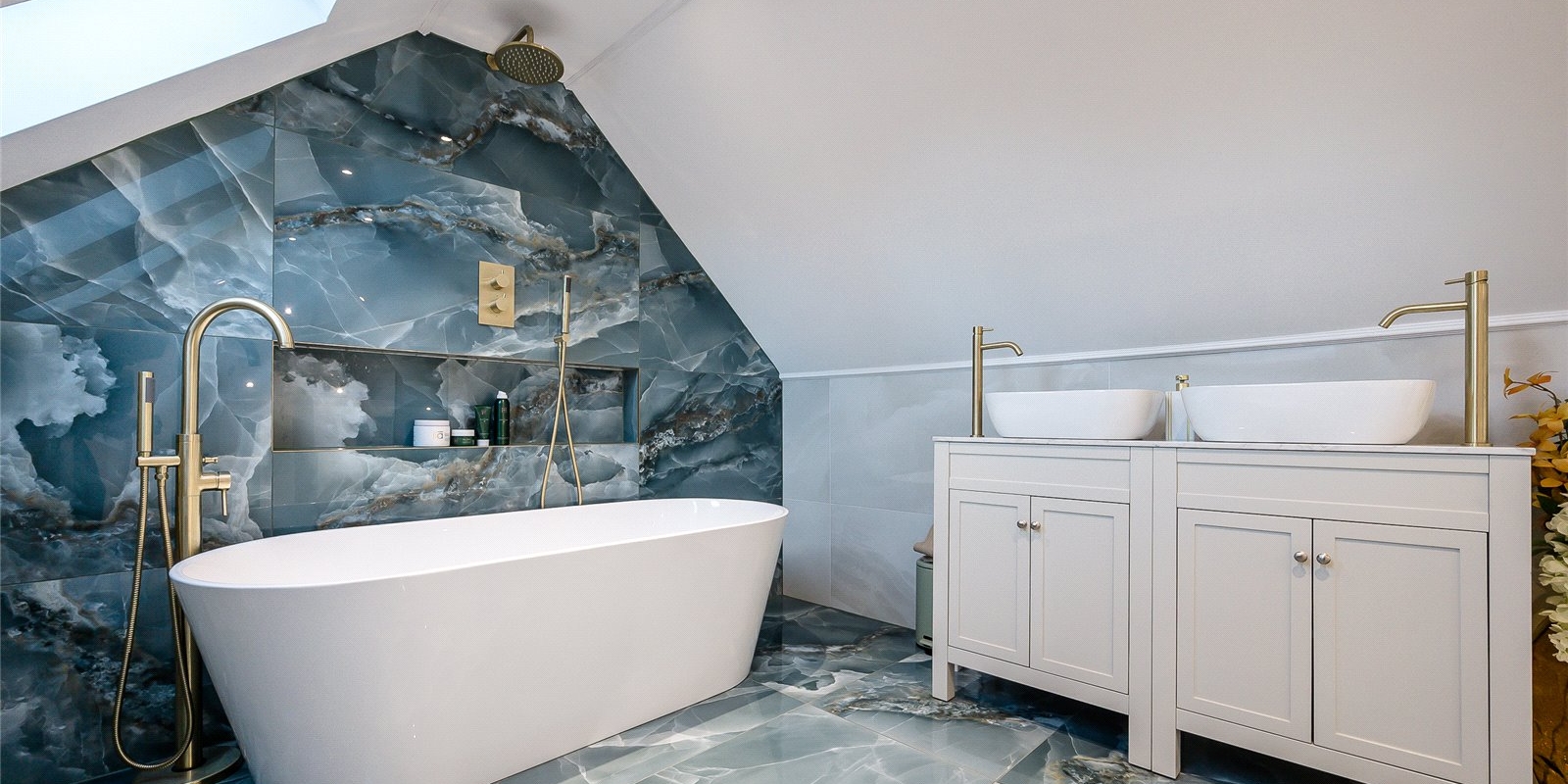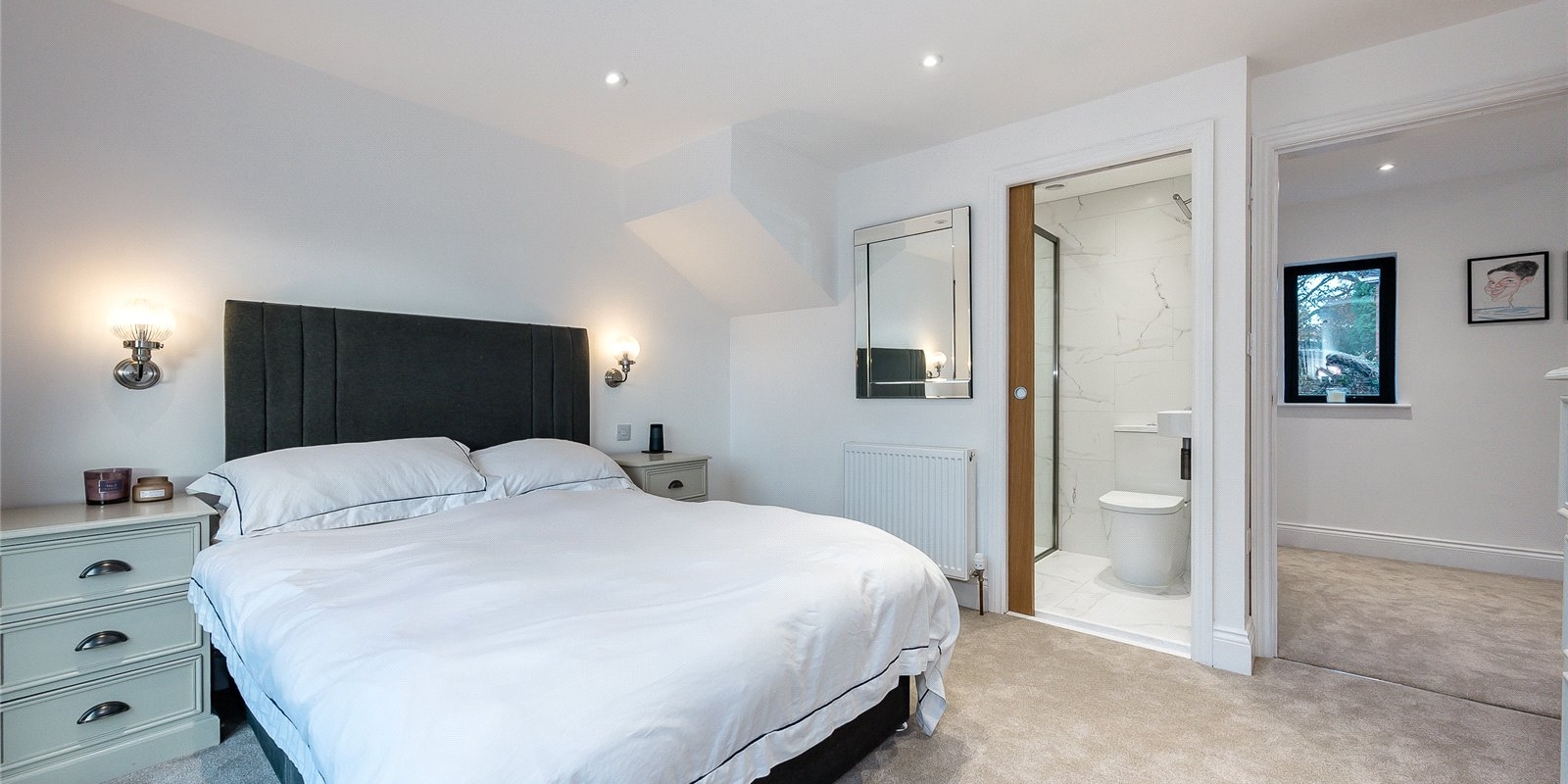 Upstairs, you'll find four generously sized double bedrooms, each boasting its own en-suite bathroom offering comfort and privacy for all. The luxurious primary suite further benefits from a walk-in wardrobe, adding a touch of indulgence.