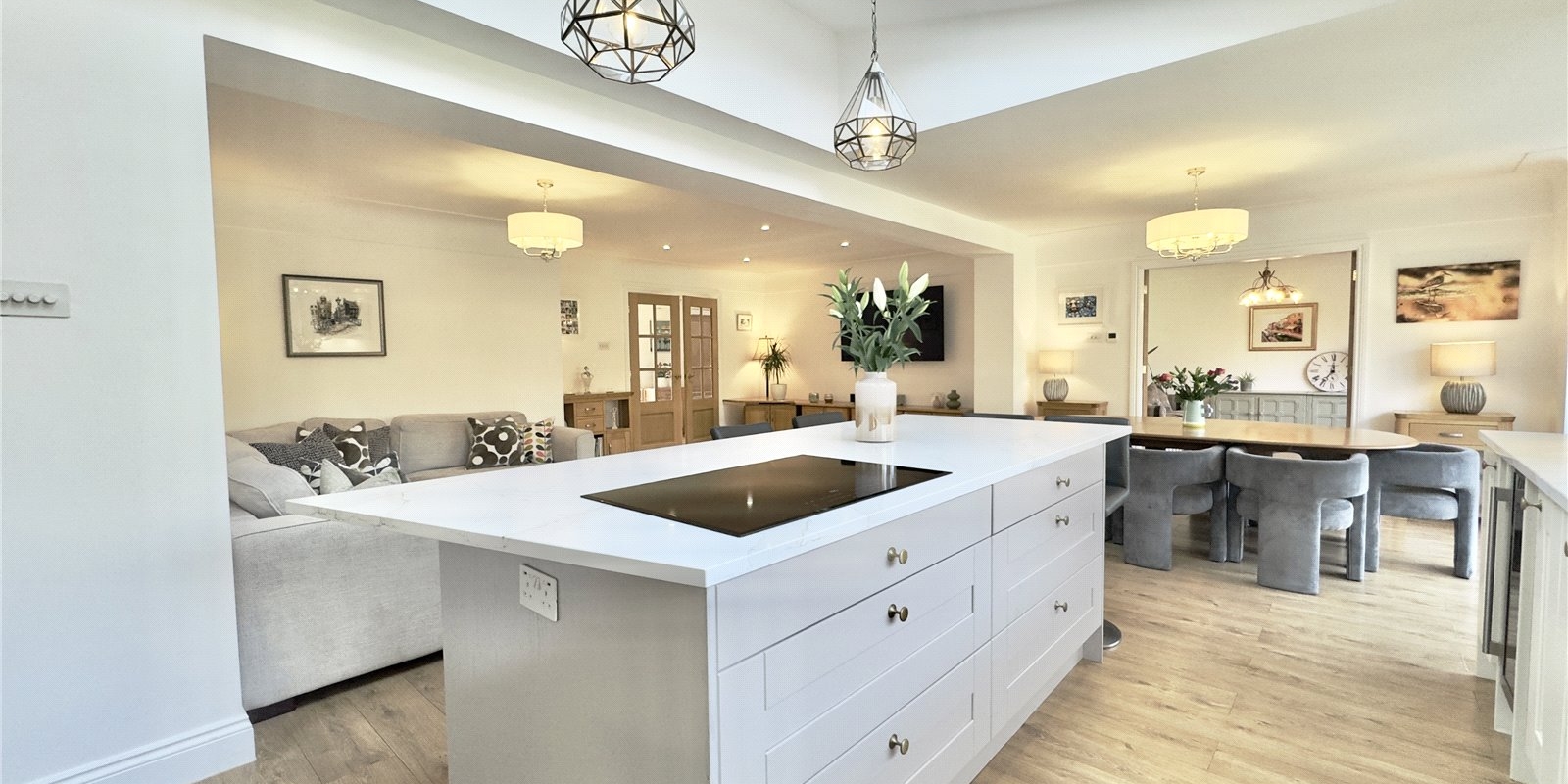 The heart of the home showcases a stunning open-plan kitchen and entertaining area, perfect for family gatherings and dinner parties alike. Additional reception rooms include a dedicated study/office space, comfortable lounge, and separate snug, providing versatility for modern living requirements.