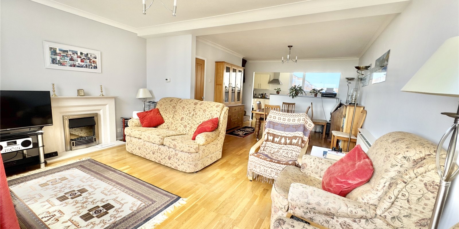 Upstairs to the first floor, you will be welcomed into the lounge, dining and open plan kitchen area. The lounge has an enclosed bay window to maximise on the views and affords extra floor space for cosy seating. Currently laid with an oak floor, the dining room and lounge flow seamlessly to the fitted kitchen with integral appliances.
