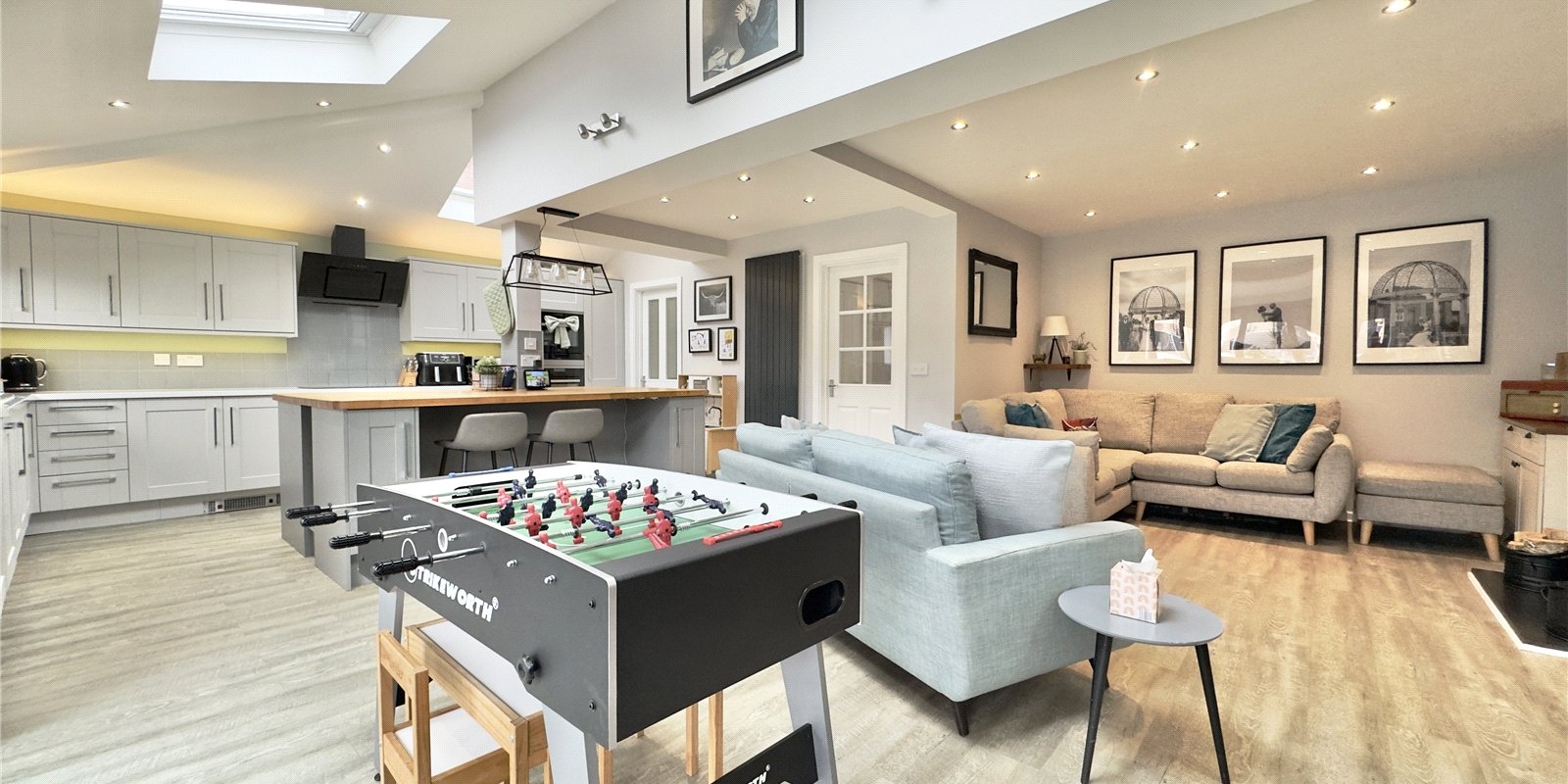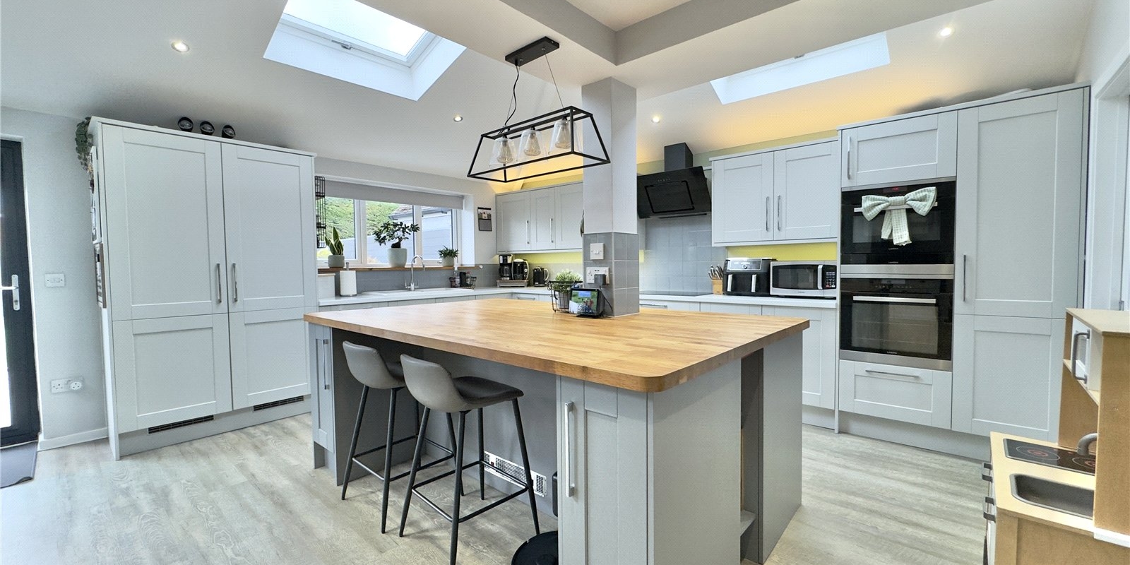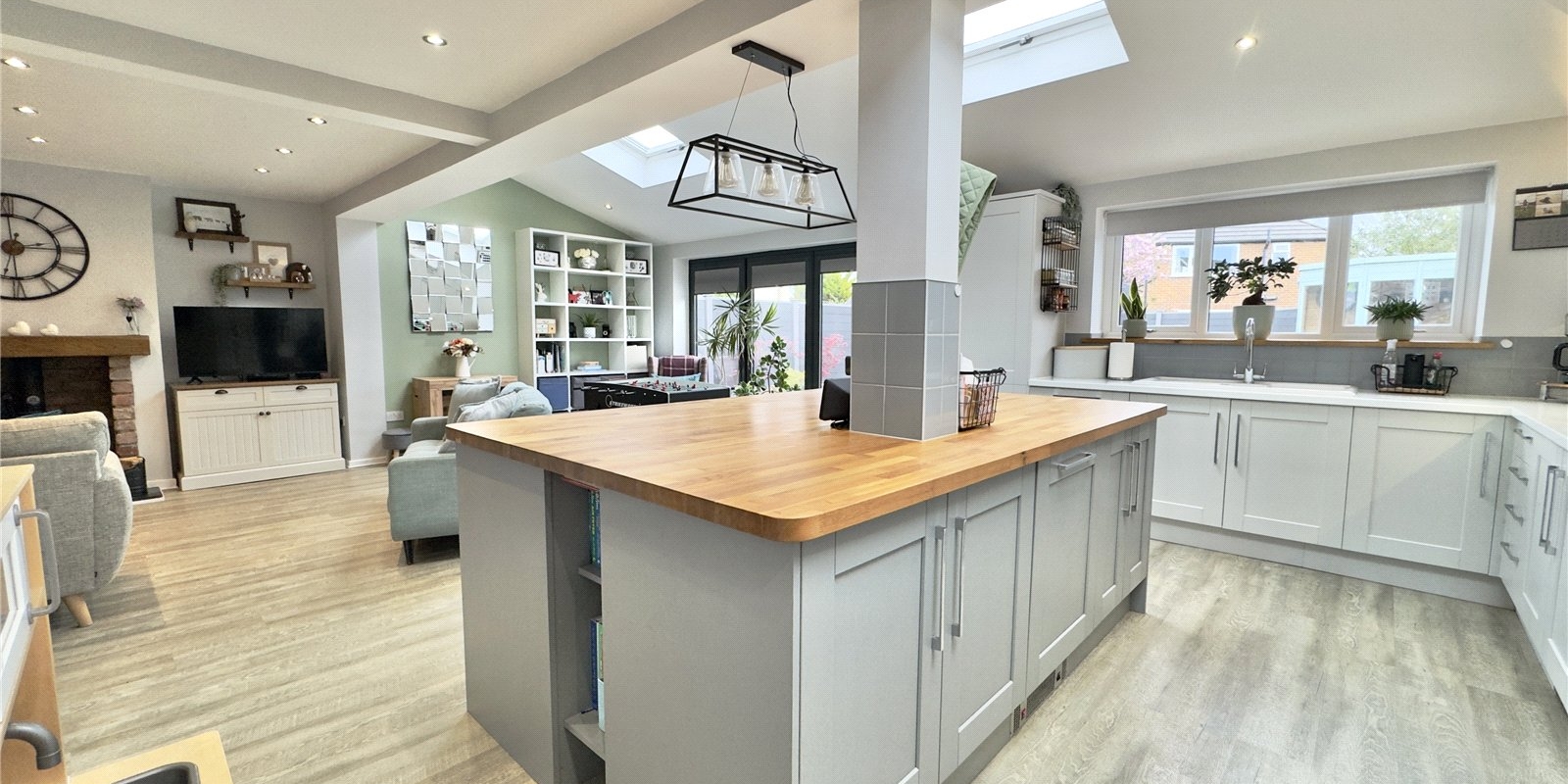 The rear of the property is undoubtedly the showpiece of the home, designed with both entertaining and everyday living in mind. The impressive extended open-plan kitchen, dining, and snug area creates a sociable hub where family and friends can gather. The stylish kitchen features a central island, perfect for casual breakfasts, coffee mornings, or hosting, along with integrated appliances and ample workspace for keen cooks. The snug area, complete with a wood-burning stove, provides a warm and inviting space during colder months, while the bi-folding doors open fully onto the garden, allowing for seamless indoor-outdoor living in the summer, ideal for barbecues, celebrations, or simply enjoying the sunshine. A separate utility room adds practicality and keeps the main living space clutter-free.